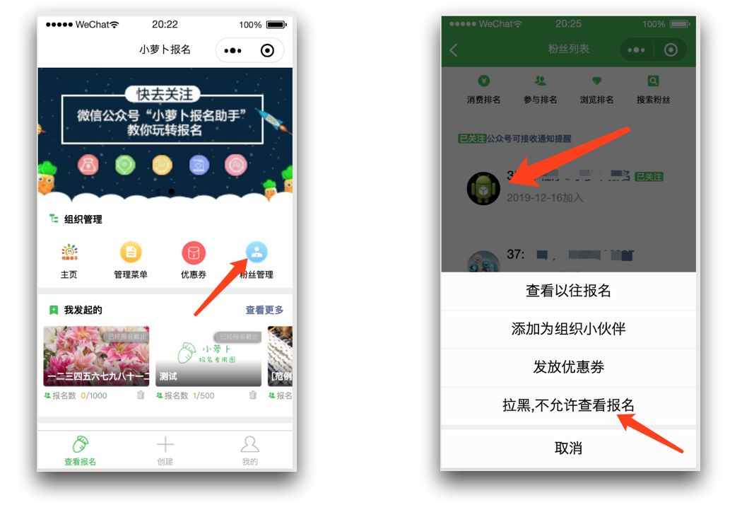 遇到这样的情况,小萝卜报名为商家提供了黑名单功能,你可以在首页的组织菜单中,点击进入“粉丝管理”,找到之前的客户,点击头像,在弹出的菜单中选择“拉黑,不允许查看报名”即可