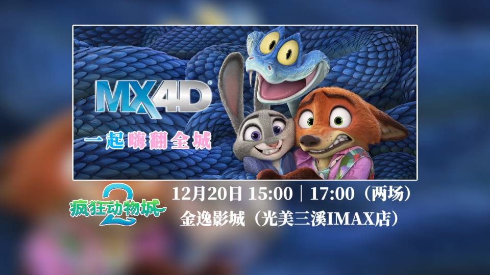 【15:00场次】签到:12月20日 14:30—15:00观影:12月20日 15:00—16:48影城:金逸影城(光美三溪IMAX店)放映:MX4D厅 英语2D(无需眼镜)价格:58/人(含票+观影物料)【17:00场次】签到:12月20日 16:30—17:00观影:12月20日 17:00—18:48影城:金逸影城(光美三溪IMAX店)放映:MX4D厅 英语2D(无需眼镜)价格:58/人(含票+观影物料)【观影物料】1.官方MX4D工艺海报2.朱迪&尼克头箍(二选一)3.盲抽撕拉拍立得4.胡萝卜笔5.明信片三款6.朱迪&尼克吧唧两款7.金属徽章(5cm)⚠️12月18日活动15:00前(48小时)可自行退票,后续开放转票功能,请合理规划行程再购票,感谢理解!@慢热观影团 #慢热观影团