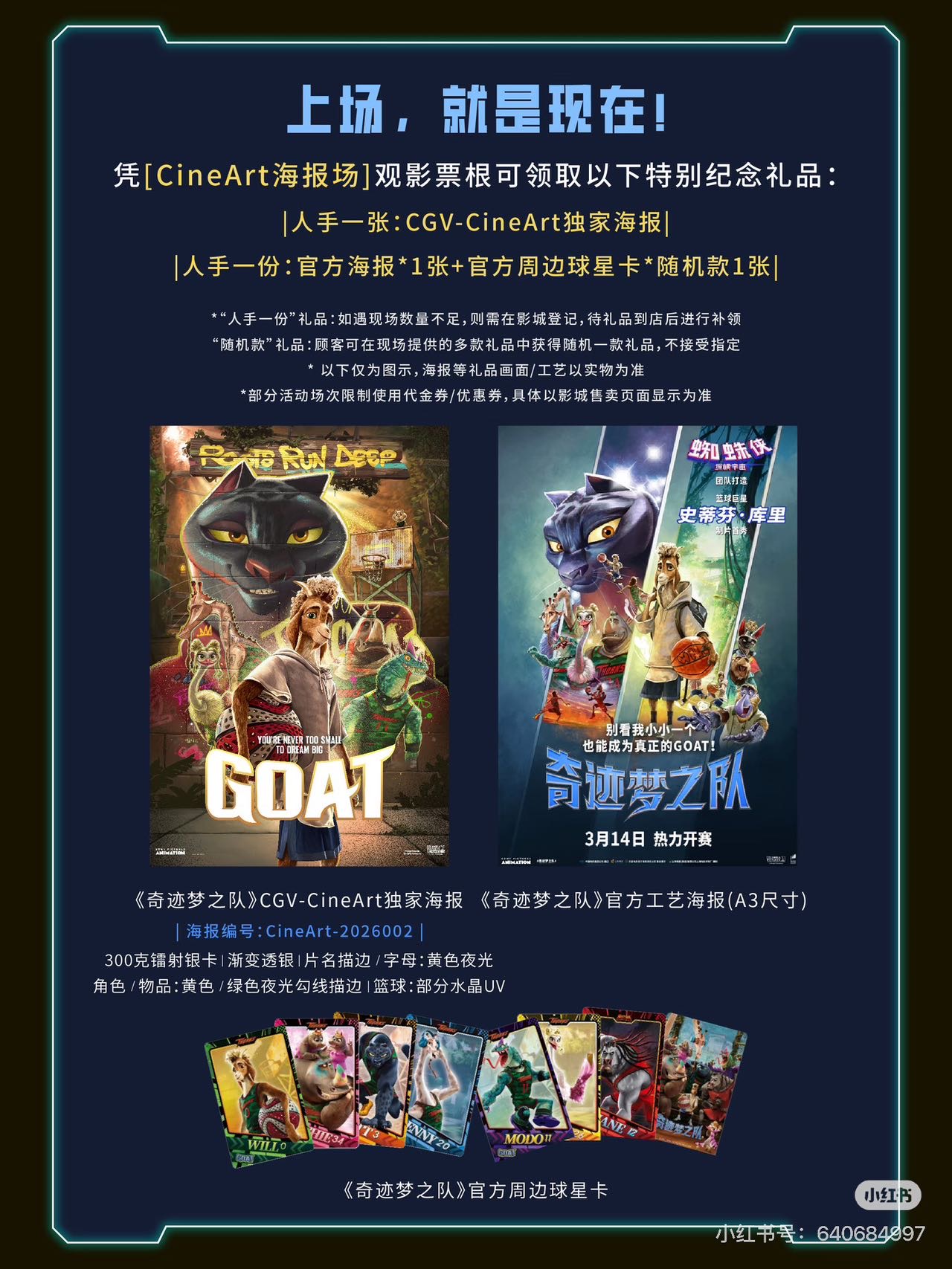 🔥见证传奇诞生,点燃心中热爱! 《奇迹梦之队 GOAT》热血来袭! 本场特别福利:人手一张:CGV-CineArt独家海报、人手一份:官方海报*1张+官方周边球星卡*随机款1张 电影:《奇迹梦之队》 时间:2026年3月15日(周日)14:00 地点:临沂CGV影城 座位:尽快报名、提前出票,限量30份 【套餐】 限量早鸟票套餐:电影票含可乐,人手一套:CGV-CineArt独家海报+官方海报*1张+官方周边球星卡*随机款1张; 【领票方式】 报名缴费即可参与,凭借报名信息开场前到影城门口签到处签到选座领票; 【购票须知】 1、一经购票不退不换,可以平价转卖或赠送; 2、购票后可扫码入群,可及时联系志愿者进群; 3、观影的过程中不得摄屏、交头接耳等,请文明观影 导演: 泰里·迪利海 / 亚当·罗塞特 编剧: 亚伦·布克斯鲍姆 / 泰迪·莱利 主演: 凯莱布·麦克劳克林 / 加布里埃尔·尤尼恩 / 斯蒂芬·库里 / 亚伦·皮埃尔 / 妮可拉·考夫兰 / 更多... 类型: 喜剧 / 动画 / 冒险 / 运动 制片国家/地区: 美国 语言: 英语 上映日期: 2026-03-14(中国大陆) / 2026-02-13(美国) 片长: 100分钟 又名: 山羊 / 史上最佳球员 / GOAT级神射手(港) / 山羊巔峰(台) 梦想成为职业球手的小山羊威尔,虽然天生身材矮小,却凭借超凡球技闯入梦寐以求的球队。然而本以为是梦想起点,没想到却是“地狱开局”,这支梦中情队不仅赛绩成绩堪忧,队友还个个都是“人才”。面对来自队友的质疑与对手的嘲讽,他能否用自己的意志点燃球队,带领这支落魄之师创造新的奇迹? @电影小憩时光 #电影小憩时光