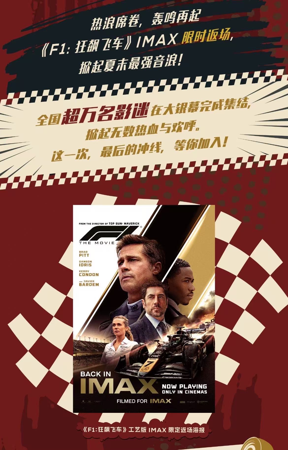 从我们7月26日第一场点映场,布拉德·皮特搏命演绎《F1》IMAX开启极速狂飙在暑期档“披荆斩棘”收获爆棚口碑,成为本暑期档口碑票房双丰收的进口片。 应广大影迷的号召,告别场来了,既是对《F1》的告别,也是对30度的温度的告别~~~~~ 电影:《F1:狂飙飞车》 时间:2025年9月26日 19:30 地点:临沂CGV影城 IMAX厅 座位:已预定座位,现场取票选座 【套餐】 限量预售票套餐:IMAX电影票+爆米花和可乐,赠IMAX新款工艺海报; 限量预售票套餐:IMAX电影票+可乐,赠IMAX新款工艺海报其他款海报剩余的 任选1张,不保证人手; 【领票方式】 报名缴费即可参与,凭借报名信息开场前到影城门口签到处签到选座领票; 【购票须知】 1、一经购票不退不换,可以平价转卖或赠送; 2、购票后可扫码入群,可及时联系志愿者进群; 3、观影的过程中不得摄屏、交头接耳等,请文明观影 导演: 约瑟夫·科辛斯基 编剧: 伊伦·克鲁格 主演: 布拉德·皮特 / 戴姆森·伊德瑞斯 / 凯瑞·康顿 / 哈维尔·巴登 / 托比亚斯·门基斯 / 更多... 类型: 剧情 / 动作 / 运动 制片国家/地区: 美国 语言: 英语 上映日期: 2025-06-27(美国/中国大陆) 片长: 156分钟 又名: F1:赛道风云 / F1电影(台) / 一级方程式 / 弯心 / 弯 @电影小憩时光 #电影小憩时光